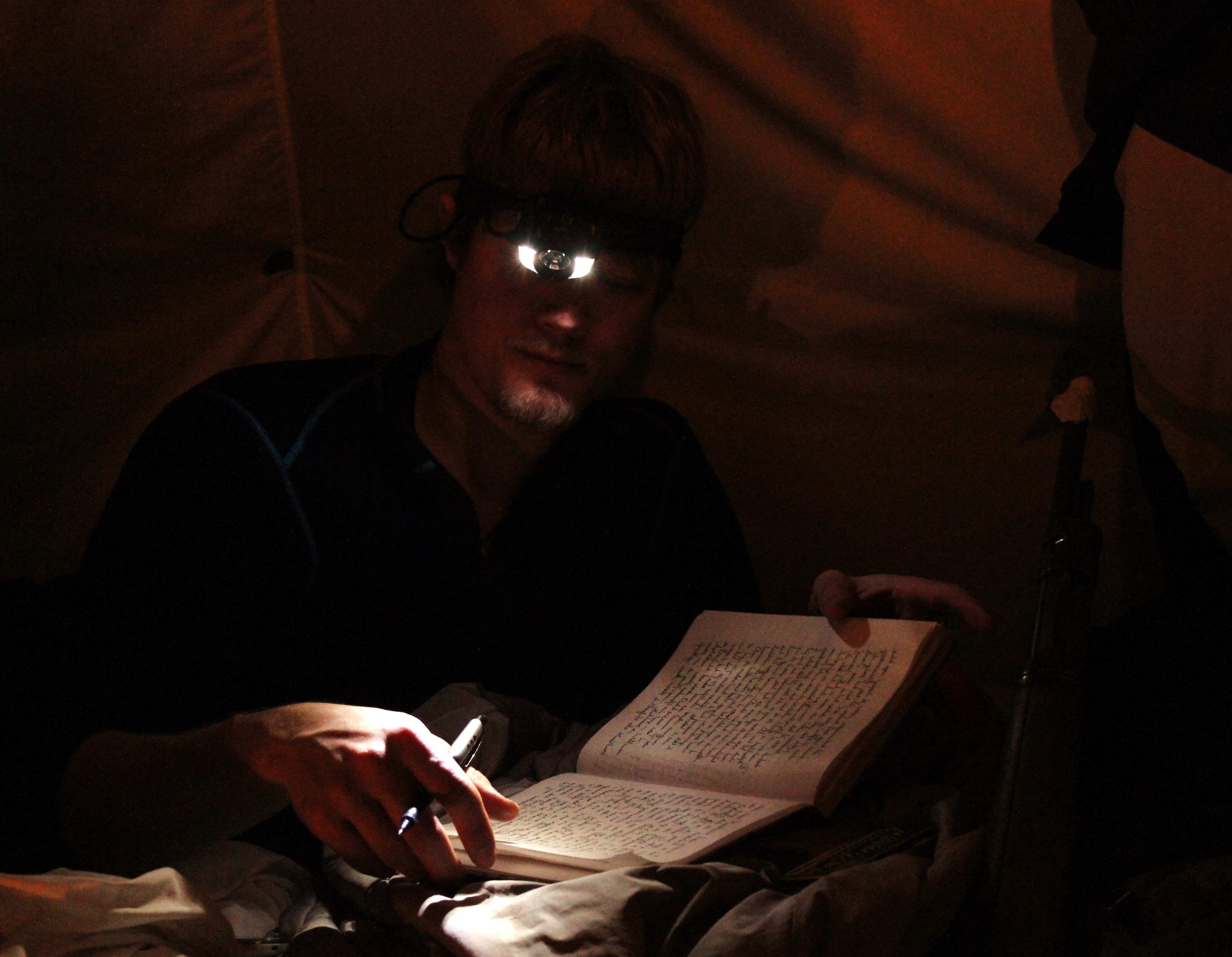 Cees updating his journal, clothes drying above and stovepipe to the left